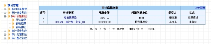 选择项目导航栏中的“审计实施阶段”,可以在右面的页面看到该阶段的成果列表,如图4.1-25所示。其他各阶段效果类似。同一项目组的成员只能看到其他成员除了“草稿”状态外的所有底稿。项目组长和主审可以看到项目成员的所有状态的底稿。每个人只能修改自己的状态为“草稿”或“复核不通过”的底稿,但可以浏览同组成员的底稿信息。