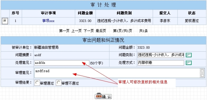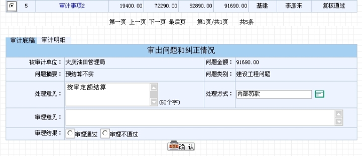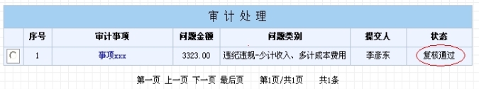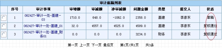在审计实施阶段,项目组长、主审对审计人员提交的底稿做第一遍复核。复核通过后,系统会自动给项目审理人发底稿审理通知。项目审理人可以在该阶段对复核通过的底稿做审理操作,设置底稿的问题类型,填写纠正情况,并可以修改审计组长对问题类型和纠正情况所作的定性。审理不通过的底稿不上项目资料卡。