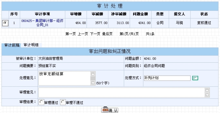 其中基建和合同类的处理意见默认为“按审定额结算”,但允许修改。