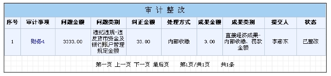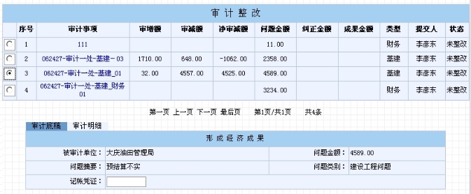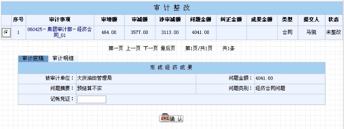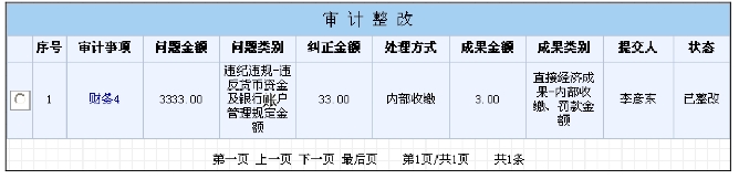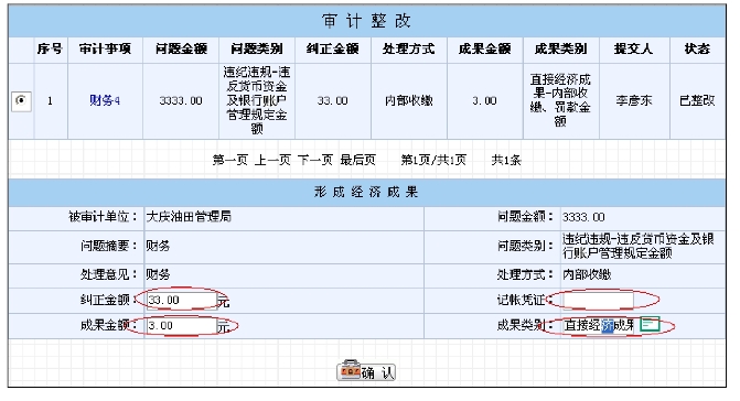 审计组长或主审可以填写、修改相应的整改信息,包括:纠正金额、成果金额、记账凭证和成果类别。