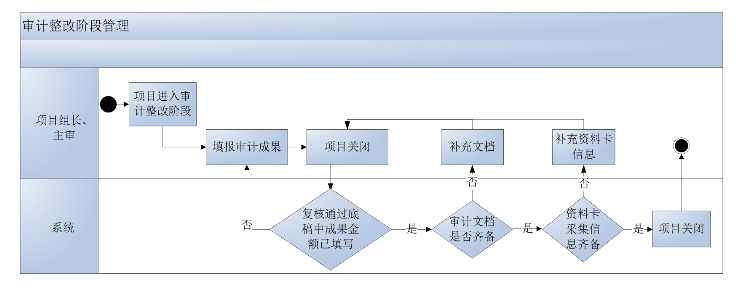 只有项目的所有审理通过的底稿整改完毕后,项目组长才能关闭项目(项目阶段管理中,置最后一个阶段状态为“完成”。审计整改阶段完成意味着项目关闭)。