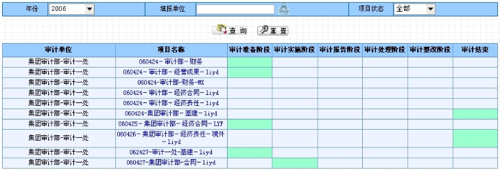 进入项目列表页面。在页面上方是可供查询的条件列表。用户可以指定要查询的项目年份、项目审计单位、项目状态,如图4.2-2所示。