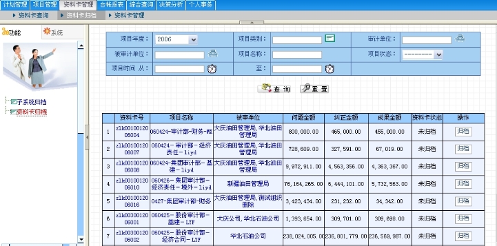 以集团公司审计部下的资料卡归档员登录系统。点击“资料卡管理”下的“资料卡归档”进入子系统归档界面,如图5.2-1所示。