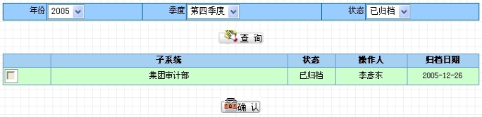 子系统归档:在右面的页面中,是各子系统在当前年份、季度下归档与否的列表,以及处理归档操作的人员信息、操作日期等。点击选择要归档的子系统,点击“确认”按钮后,系统对该子系统下的所有已完成的项目资料卡进行归档操作;也可以根据年份、季度和项目状态来约束要归档的子系统资料卡,如图5.2-2所示。