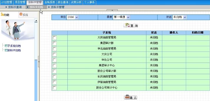 在左面的导航栏中有子系统归档和资料卡归档两个操作。系统自动取子系统归档为第一步操作。在右面的页面列出了各子系统在当前档期内归档的情况。