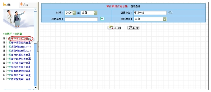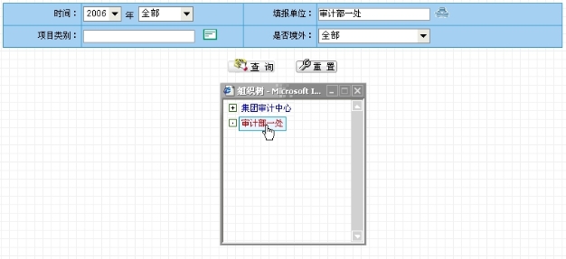 点击导航栏中的“审计项目汇总台账”,右边页面显示出查询条件,包括时间和填报单位,如图6.1-1所示。