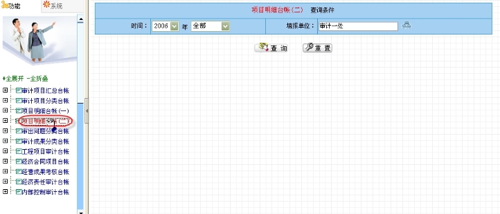 点击导航栏中的“审计项目明细台账(二)”,右边页面显示出查询条件,包括时间和填报单位,如图6.1-19所示。