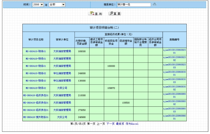 审计项目明细台账(二)显示的是财务类底稿列表,同明细台账(一),在显示项中侧重显示各个底稿形成的经济成果。