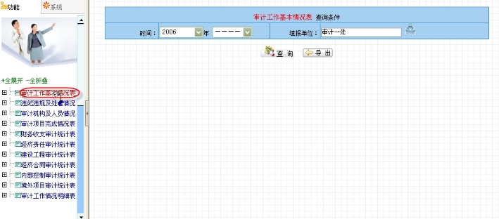 点击导航栏中的“审计工作基本情况表”,右边页面显示出查询条件,包括时间、填报单位,如图6.2-1所示。