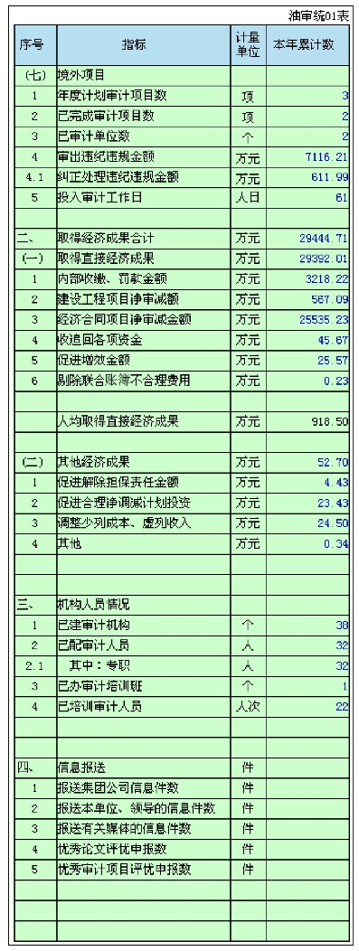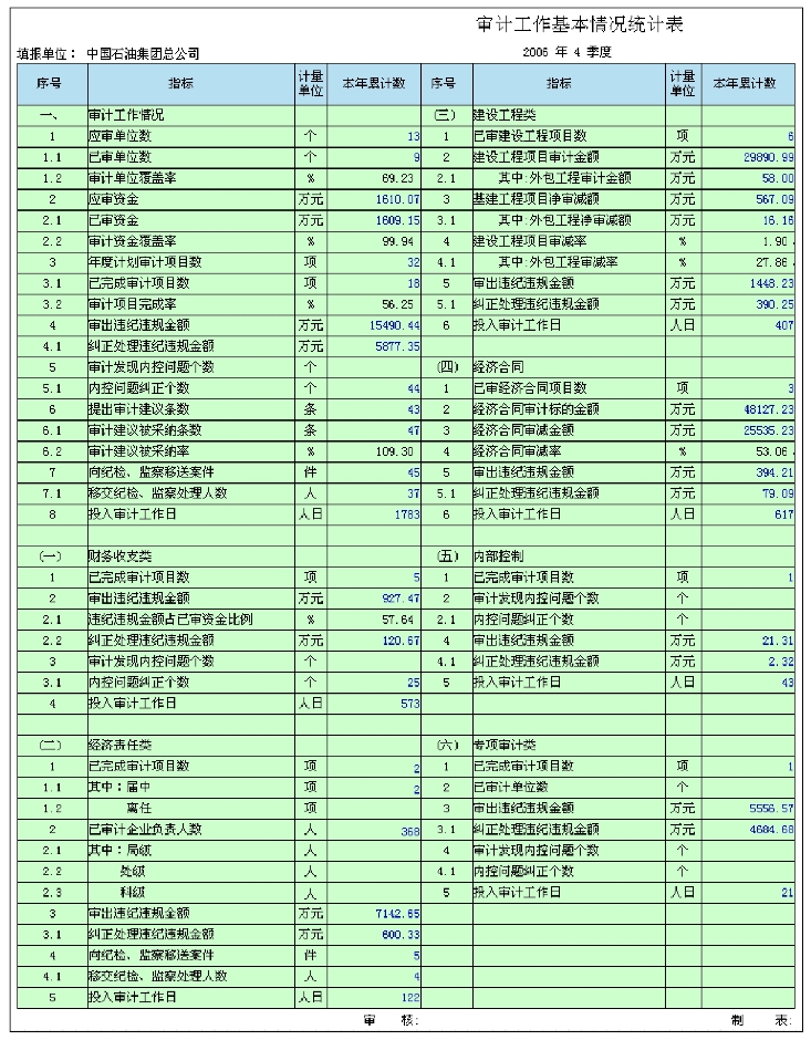 审计工作情况统计报表是对一段时间内(可以具体到季度)填报单位(登录人被授权可以查看的单位)的审计工作情况汇总的报表。