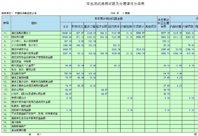 违纪违规及处理情况表是对一段时间内(可以具体到季度)填报单位(登录人被授权可以查看的单位)的财务类审计项目审出问题的分类汇总报表。