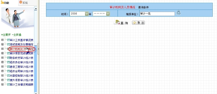 点击导航栏中的“审计机构及人员情况表”,右边页面显示出查询条件,包括时间、填报单位,如图6.2-6所示。