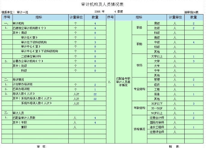 对于审计机构及人员情况表,报表统计了两个方面,一个是审计项目完成情况,一个是审计机构及人员情况。审计项目完成情况从年度计划数、本季完成数、在审数等方面统计项目的完成情况。审计机构及人员情况对已经建立的审计机构数、审计人员数以及培训班情况进行了统计。