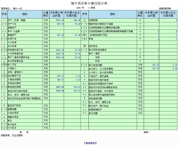 境外项目审计统计表是对填报单位的境外项目的汇总,统计显示各种问题类别的审出问题金额及其纠正处理金额。