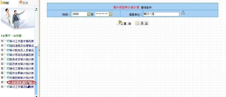 点击导航栏中的“境外项目审计统计表”,右边页面显示出查询条件,包括时间、填报单位,如图6.2-20所示。