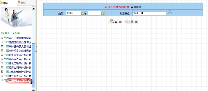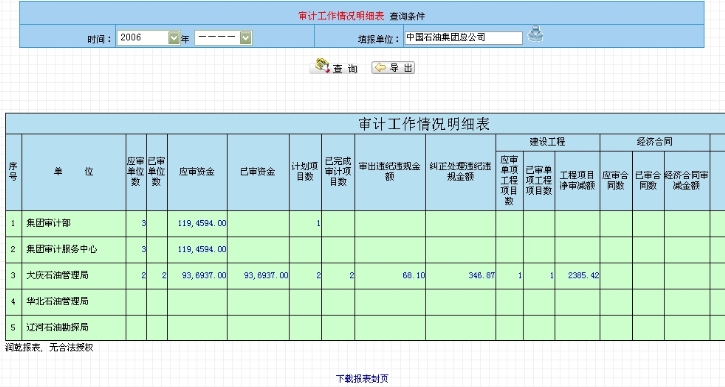 点击导航栏中的“审计工作情况明细表”,右边页面显示出查询条件,包括时间、填报单位,如图6.2-22所示。