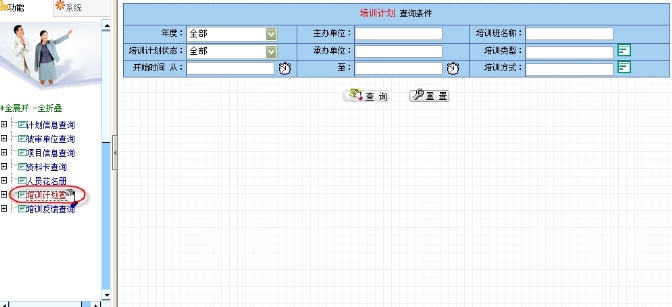 点击“综合查询”→“培训计划查询”,右边页面列出查询条件,如图7.1-14所示。