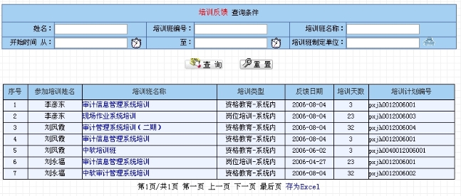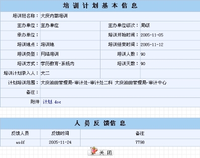 相关业务:培训计划发布后,受训人员可以填写培训情况反馈,这里查询的是相关培训计划的受训人员所填写的培训反馈列表。