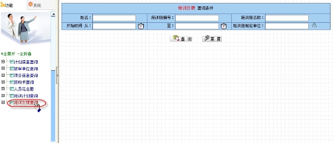 点击“综合查询”→“培训反馈查询”,右边页面列出查询条件,如图7.1-17所示。