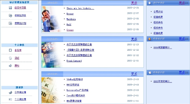 个人待办模块作为个人事务模块组的入口页面,同时也是整个审计信息管理系统的入口页面,将整个系统中较为常用和重要的几个功能模块都罗列其中,方便用户使用,如图8.1-1所示。