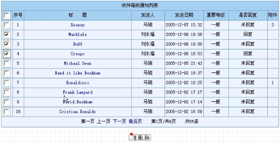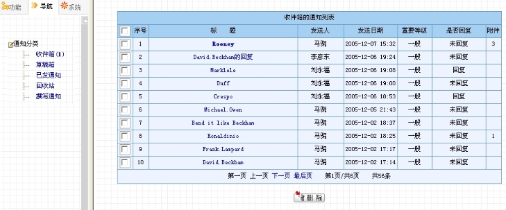 点击导航栏中的“收件箱”后,主窗口将显示“收件箱的通知列表”页面,从中可以查看系统中其他用户给当前人的来信,每页显示10封来信。新邮件会加粗显示,并会在导航栏中显示新邮件的数量,如图8.3-17所示。