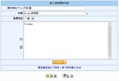 点击“回复”按钮进入信件的回复页面。该页面中,将原信件的内容作为被回复信件的信息,方便用户进行修改,同时也可以添加附件(以上过程和撰写通知功能的操作过程相同,详细内容用户可查看撰写通知功能的相关介绍)。当一切就绪后,点击“回复”按钮,发送回复信件,如图8.3-21所示。发送成功后跳转回“收件箱的通知列表”页面。