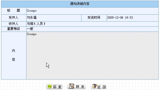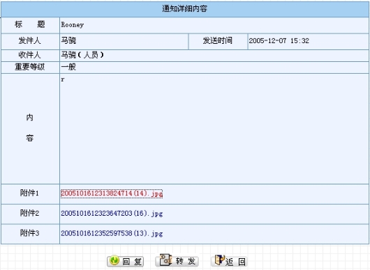 点击“转发”按钮进入信件的转发页面。该页面中,原信件的内容作为被转发信件的信息。逻辑上转发信件无须改变其内容,但系统还是允许用户修改除附件外的其他信件信息。当一切就绪后,点击“转发”按钮转发信件,发送成功后跳转回“收件箱的通知列表”页面。