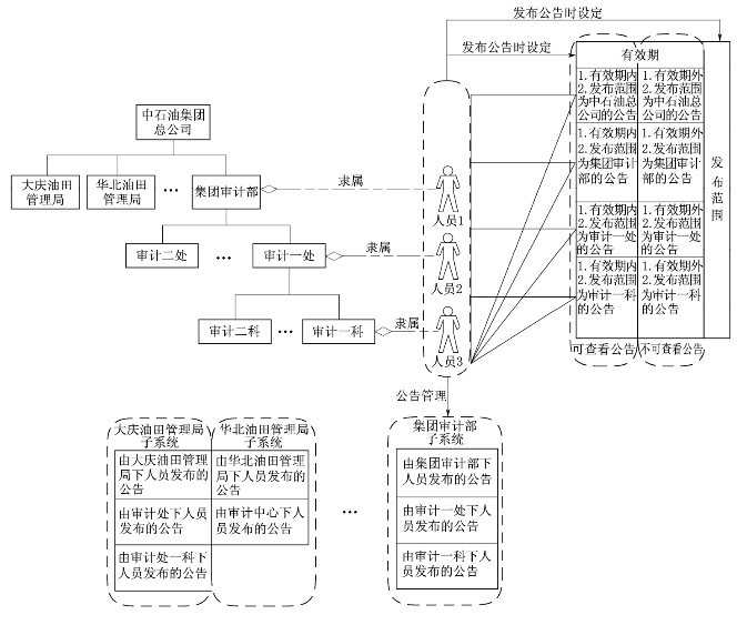 该业务流程图以中石油集团总公司下的集团审计部为例,对公告的发布操作、公告的查看权限以及公告管理的范围做出了概括。