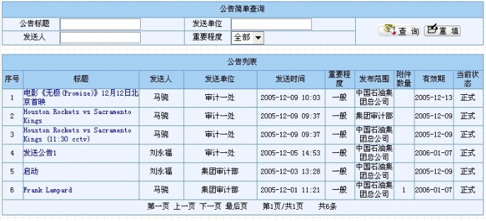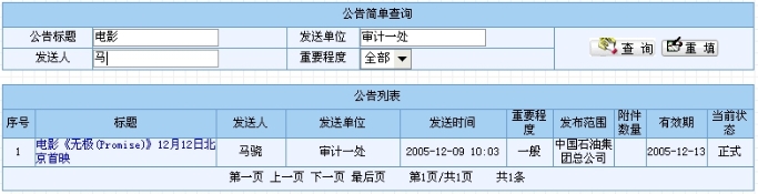 该页面主要由两部分组成。上半部分是公告的简单查询,用户可以在各查询条件框(包括“公告标题”、“发送单位”和“发送人”条件框,而“重要程度”用户可以以选择的方式来设定)内输入查询信息,点击“查询”按钮即可得到符合查询条件的公告。重填操作便于用户一次性清空所填的查询条件。一般的查询情况如图8.4-4所示。