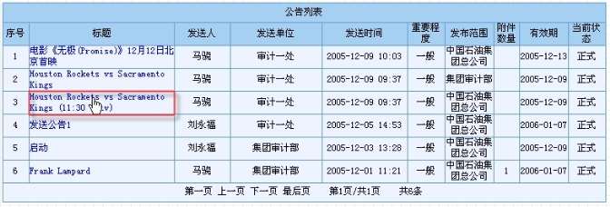 页面的下半部分是公告列表,显示了公告标题、发送人、发送单位、发送时间、重要程度、发布范围、附件数量、有效期和当前状态的信息,如图8.4-5所示。点击某个公告的标题即可查看该公告的详细信息,如图8.4-6所示。
