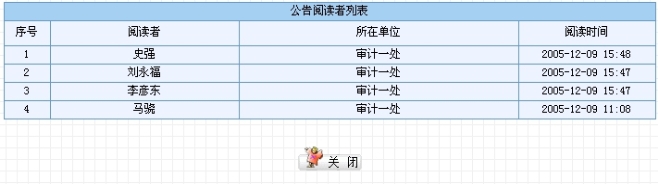 该公告列表显示的信息较之前的几乎一样,唯一增加了“阅读者”这一栏。点击已发布公告的“阅读者”栏中的“查看”,即可了解该公告的被阅读情况,如图8.4-10所示。