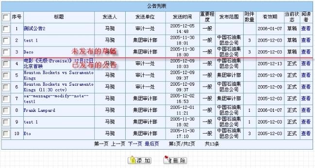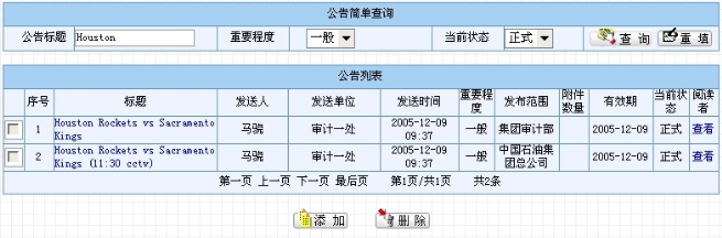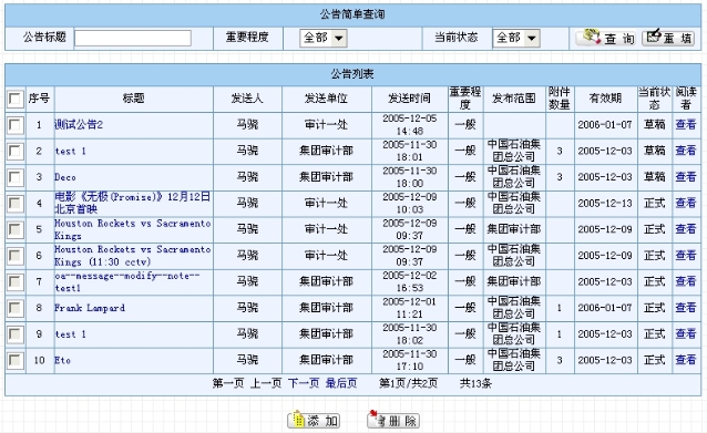 该页面分为上下两部分:公告查询和公告列表。此处的查询提供给用户“公告标题”、“重要程度”(可选择“全部”、“一般”和“重要”)和“当前状态”(可选择“全部”、“草稿”、“正式”和“过期”)作为查询条件。一般的查询情况如图8.4-8所示。