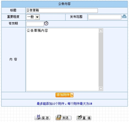 用户可以在原有草稿的基础上对其进行修改,最后可根据实际情况将修改后的公告草稿发布或是仍旧保存为草稿(其具体操作与发送公告操作相同,参看发送公告功能模块的介绍)。