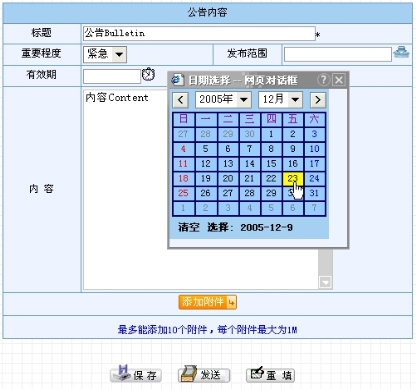 对于“重要程度”一项,用户可以为所写公告选择“一般”或是“紧急”。而公告有效期是由点击时钟图标弹出的日期选择框来设定,如图8.4-15所示。需要注意的是所选日期需等于或晚于当前日期,否则在发布时系统会弹出“有效期小于当前日期”的警告框(若保存为公告草稿则没有关系)。