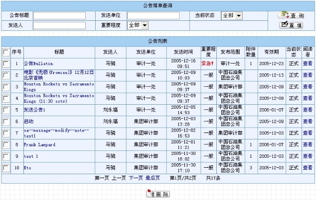 对于子系统内已经发布的公告进行管理,可以删除过期的公告等。