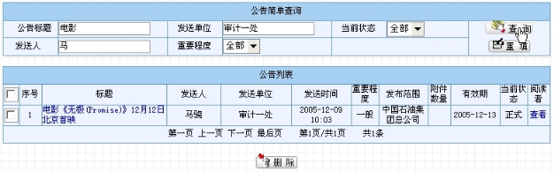 公告管理页面中显示的是发送单位为登录人所属的子系统下组织的所有公告(即发布者属于当前子系统的所有公告)。页面分为“公告简单查询”及“公告列表”两部分。此处的查询提供给用户“公告标题”、“发送单位”、“发送人”、“重要程度”(可选择“全部”、“一般”和“重要”)和“当前状态”(可选择“全部”、“正式”和“过期”)作为查询条件。一般的查询情况如图8.4-19所示。