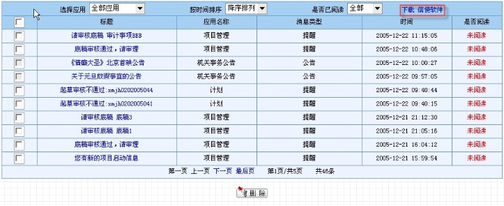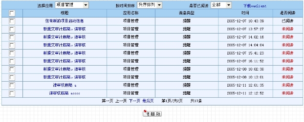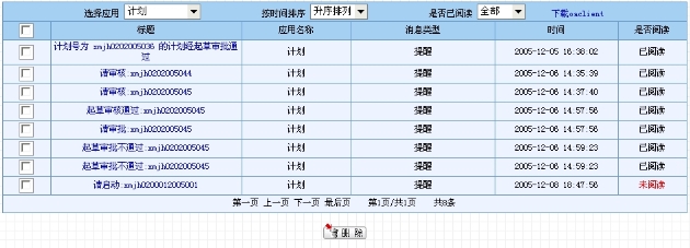 信使管理中的提示消息来自不同的应用,包括项目管理、计划管理、个人通知及机关事务公告,用户可在“选择应用”栏中选择相应的应用来集中显示同一应用中的所有消息,并在“按时间排序”和“是否已阅读”栏中选择选项来规范显示方式。