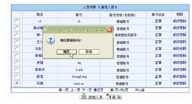 选中一人员账号,然后点击“删除”按钮,确认后可将其从系统中删除,如图9.2-9所示。