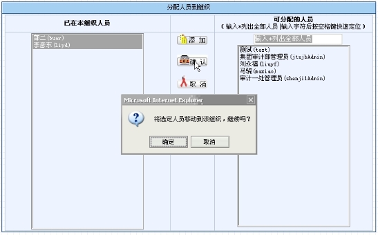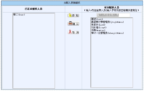 页面左边显示已隶属于该组织的人员,页面右边则显示可分配至该组织的人员。在右边“可分配的人员”栏中点击人员,点击“添加”按钮(或是双击该人员)即可将该人员添加至该组织,点击“确定”按钮执行该操作,如图9.2-15所示。