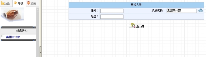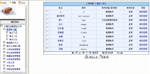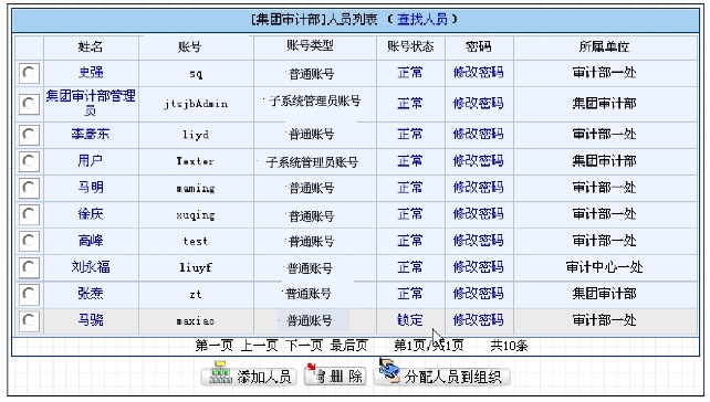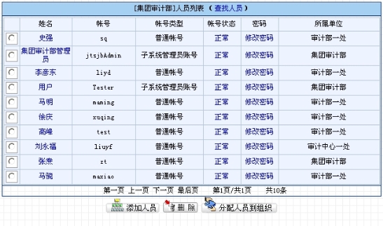 如果不想查询,可以直接从左边的组织树中选择要查看的单位,点击单位的名称,右边页面显示出此单位的所有人员,例如点击“集团审计部”,则显示出集团审计部的所有人员,如图9.2-3所示。