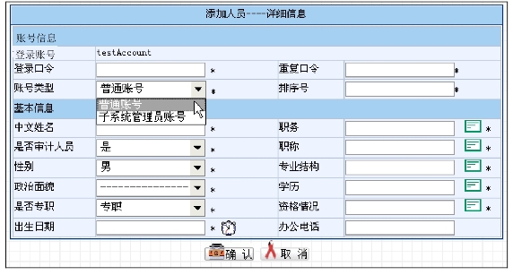 填写具体的人员信息,完毕后点击“确认”按钮,将为系统添加一人员账号。