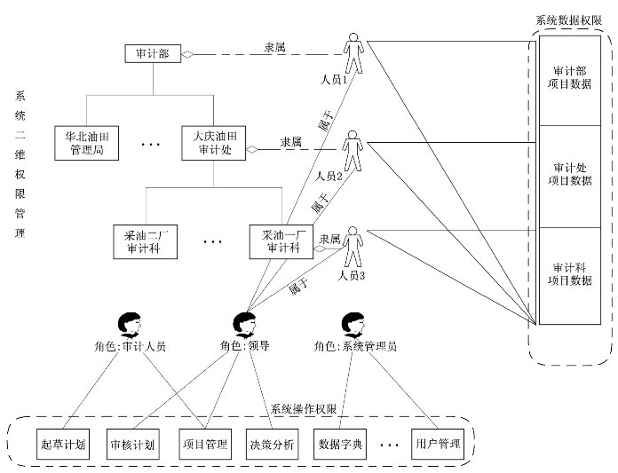 系统的权限划分从逻辑上可以分为操作权限和数据权限。操作权限即功能权限,用户能否使用系统的某项功能就要看其是否具备了这项功能的操作权限,而数据权限特指当用户具备了某项功能后,他能够处理的那些数据范围。如,集团公司审计部某用户其操作权限是项目查询,数据权限范围是整个系统,则他可以查看整个系统的项目信息。同理,如大庆油田管理局下的某用户,其具有同样的操作权限,但数据权限范围是大庆油田管理局所辖的数据,则其只能查看到大庆油田管理局的项目信息,如图9.3-1所示。