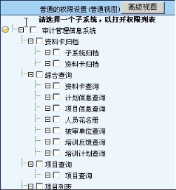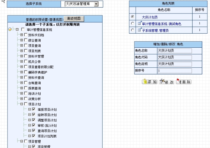 进入以后,界面左侧显示的为系统的操作权限列表,以树状结构展示,点击节点上的加号可以查看子节点的权限。界面的右侧显示的是当前子系统内已有的角色,选中角色前的选项框,系统自动显示出此角色包含的对应权限。右侧下半部分包括对角色的操作,有添加、修改、删除,如图9.3-3所示。