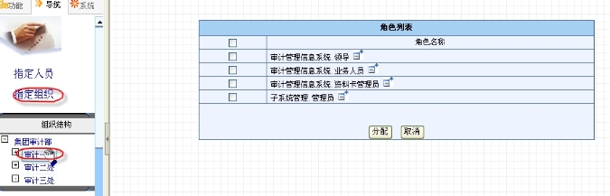界面左侧显示的为当前子系统的组织树,以及权限的分配方式(即指定人员和指定组织两种)。