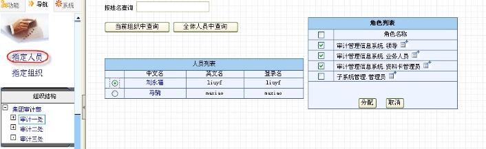 点击左侧组织树中的组织节点,中间的人员列表会显示此组织下的人员。选择对应的人员,如果此人已经被分配过角色,右侧的角色列表中已分配过的角色前会有标记。管理员可以修改对应的角色分配,修改完后点击“分配”按钮即可。