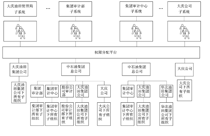 集团审计部作为一个特殊的子系统,其下的人员通过权限分配平台可获得中石油集团总公司下包括集团审计部、集团审计中心、股份公司审计部、大庆油田集团公司、大庆公司等在内的所有组织的相关权限;而类似集团审计中心等子系统下的人员通过权限分配平台可获得集团审计中心本系统和所有与大庆油田集团公司性质相同的子系统的相关权限;与大庆油田集团公司等子系统类似,其下人员通过权限分配平台可获得大庆油田集团公司本系统的相关权限。