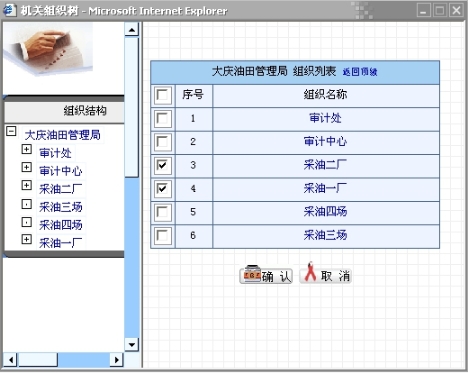 在该页面中左边是子系统组织结构树,右边是子系统组织列表。用户可以通过点击组织树来定位到所点组织的子组织列表,也可以在组织列表中点击组织的名称,层层向下地定位到特定组织的子组织列表。然后勾选允许“大一”查看的组织,并点击“确认”按钮进行添加,如图9.4-6所示。