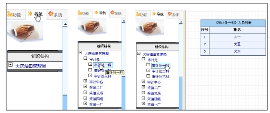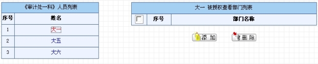 在组织结构树中点选某个组织,主窗口就会显示该组织下的人员列表,如图9.4-3所示,审计处一科下有“大一”、“大五”、“大六”三个人。