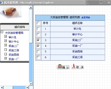 在该页面中左边是子系统组织结构树,右边是子系统组织列表。用户可以通过点击组织树来定位到所点组织的子组织列表,也可以在组织列表中点击组织的名称,层层向下地定位到特定组织的子组织列表。然后勾选允许“大一”查看的组织,并点击“确认”按钮进行添加,如图9.4-12所示。