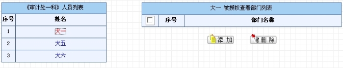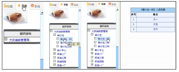 在组织结构树中点选某个组织,主窗口就会显示该组织下的人员列表,如图9.4-9所示,审计处一科下有“大一”、“大五”、“大六”三个人。